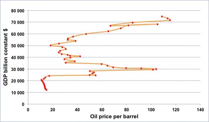 Ce graphique représente, pour chaque année entre 1960 et 2013, le PIB mondial en milliards de dollars constants (axe vertical) et le prix du barril en dollars constants (axe horizontal). L’année 1960 correspond au point en bas à gauche, puis les points suivent l’ordre chronologique.