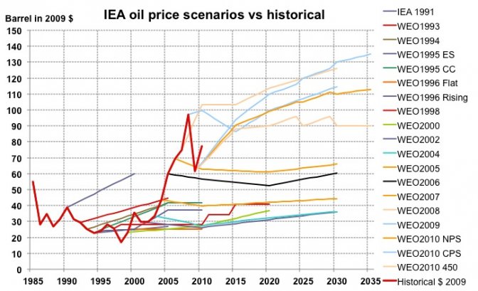Evolution du prix du baril en dollars constants entre 1985 et 2011 (courbe rouge, légende "historical $ 2009") et projections de prix faites par l’Agence Internationale de l’Energie entre 1991 et 2010 (chacune est datée de l’année de publication, avec parfois des variantes qui donnent le sigle qui suit l’année). Pas une seule ne tombe juste plusieurs années de suite, et quand la tendance a été la bonne cela ressemble plus à un coup du hasard qu’à une grande science de la prévision.
