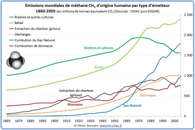 Un billet sur le CO2 et méthane, faisant suite à un billet sur les Gaz à Effet de Serre. Olivier Berruyer, l’auteur de ce blog, est actuaire. Il parle beaucoup de la crise financière et bataille en ce moment pour un renforcement de la législation sur la séparation des banques de dépot et d’investissement. Mais il traite aussi de toutes "les crises" actuelles et en particulier de la crise climatique. Chaque billet comporte assez peu de texte mais de nombreux graphiques originaux. Dans ce billet sur le dioxyde de carbone et le méthane il met l’augmentation de la concentration de ces deux gaz dans l’atmosphère dans une perspective économique, historique, politique, physique...humoristique. Dans le billet suivant, il analyse les émissions